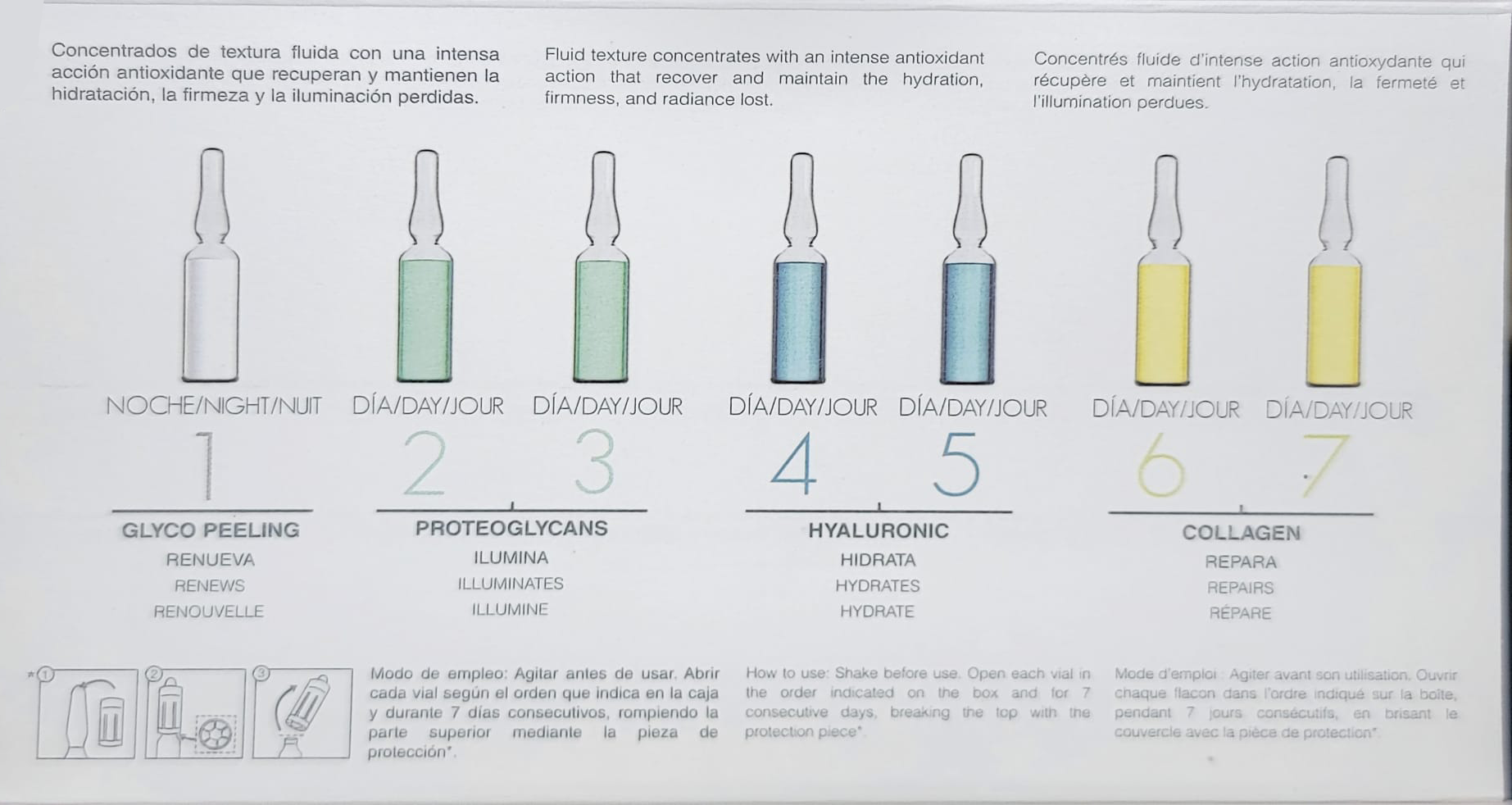 Je start op dag 1 's avonds met een glycolzuurpeeling ampulle. Vanaf dag 2 tot dag 7 breng je elke ochtend een ampulle serum aan op je gelaat en hals onder je dagcrème.